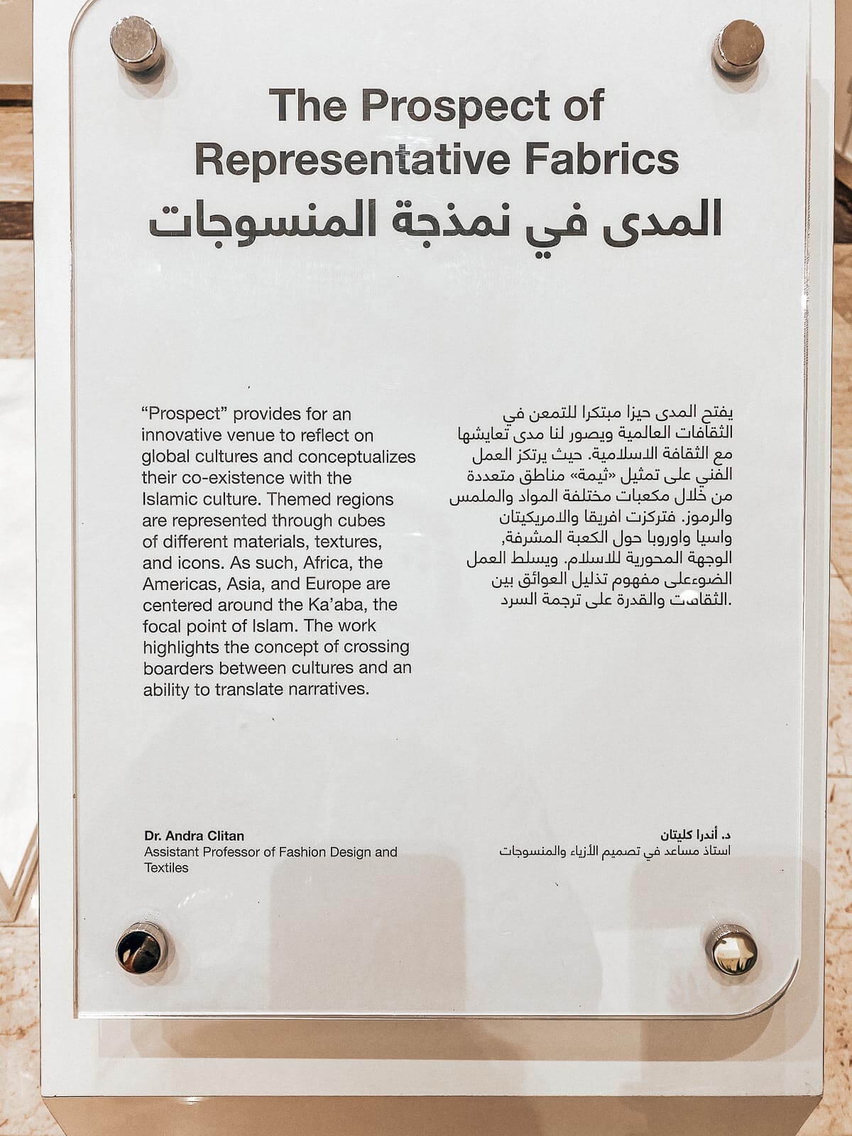 “Prospect” provides for an innovative venue to reflect on global cultures and conceptualizes their co-existence with the Islamic culture. Themed regions are represented through cubes of different materials, textures, and icons. As such, Africa, the Americas, Asia, and Europe are centered around the Ka’aba, the focal point of Islam. The work highlights the concept of crossing boarders between cultures and an ability to translate narratives.